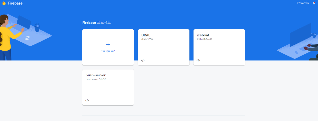 Firebase 홈페이지에서 회원가입을 한 후 '콘솔로 이동'을 클릭 해 콘솔로 이동하면 다음과 같은 페이지가 나오면