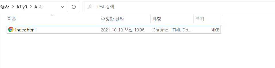 C:\Users\lchy0\test에 들어가보면 index.html이 생성된 것을 확인할 수 있습니다.