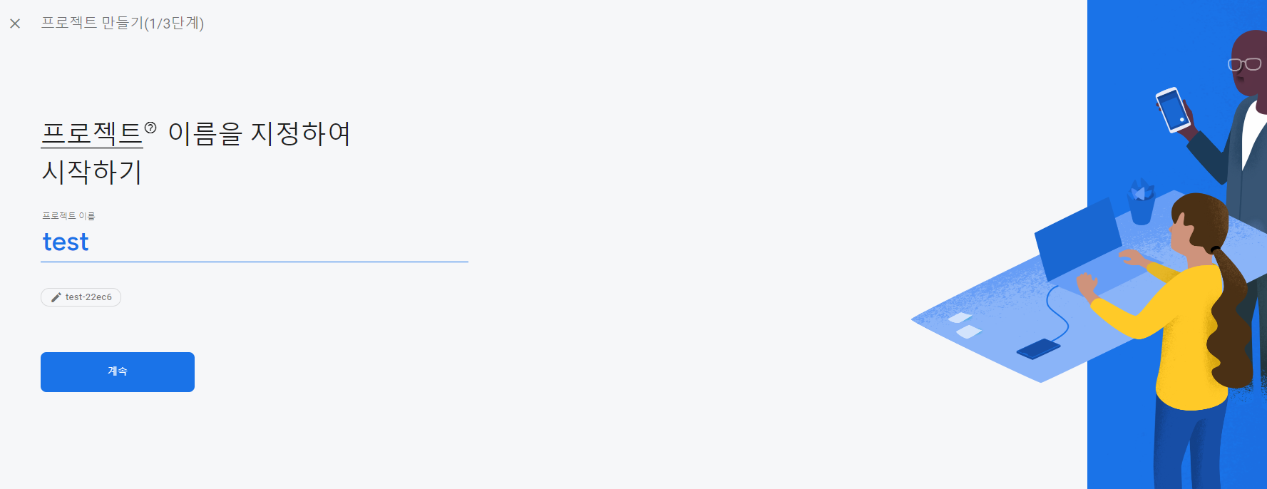 프로젝트 이름을 적어주고 '계속' -> '프로젝트 만들기'를 누른 후 조금만 기다려주면 프로젝트가 만들어집니다.