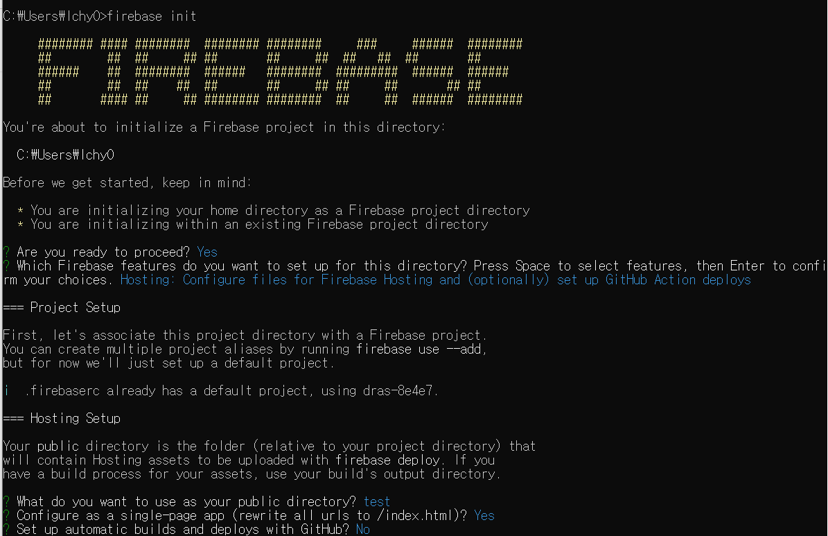 - Are you ready to proceed? Yes![]() - What do you want to use as your public directory? test (이미지 기준으로 C:\Users\lchy0 밑 test 폴더에 만든다는 의미) - Configure as a single-page app (rewrite all urls to /index.html)? Yes (index.html를 생성하겠다. 나중에 수정해 줄 예정) - Set up automatic builds and deploys with GitHub? No |
