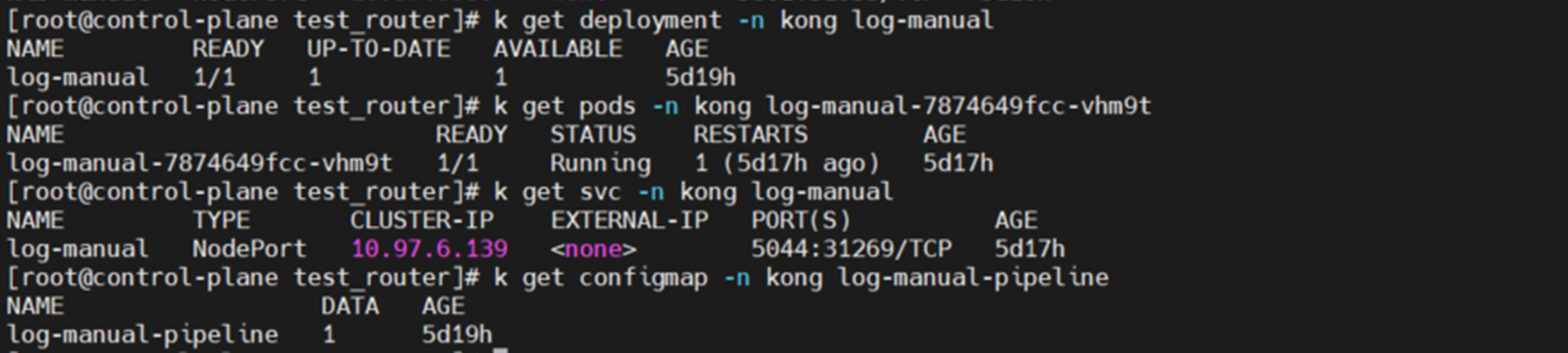 kubectl expose deployment log-manual --type NodePort --port 5044 -n kong # service 생성