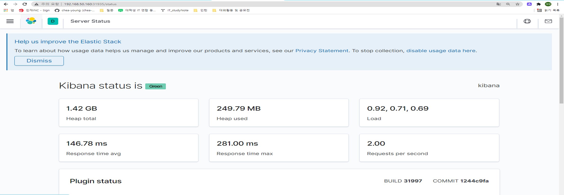 - 해당 문서에서는 Kibana의 포트가 `31935` 입니다. 이 포트 번호는 계속 사용되기 때문에 기억해주세요.