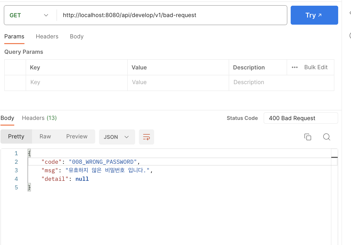 - msg: 전달 받은 에러 코드에 대한 설명으로, 해당 에러가 어떠한 상황에 발생한 에러인지 알 수 있도록 도움