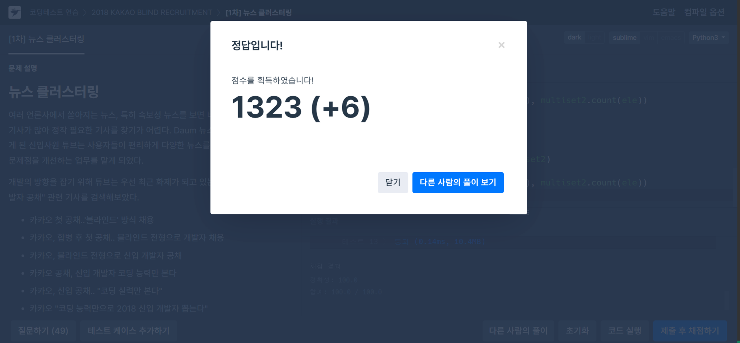 문제내용 유사한 기사를 묶는 기준을 정하기 위해서 논문과 자료를 조사하던 튜브는 "자카드 유사도"라는 방법을 찾아냈다. 자카드 유사도는 집합 간의 유사도를 검사하는 여러 방법 중의 하나로 알려져 있다. 두 집합 A, B 사이의 자카드 유사도 J(A, B)는 두 집합의 교집합 크기를 두 집합의 합집합 크기로 나눈 값으로 정의된다. 이를 이용하여 문자열 사이의 유사도를 계산하는데 이용할 수 있다. 문자열 "FRANCE"와 "FRENCH"가 주어졌을 때, 이를 두 글자씩 끊어서 다중집합을 만들 수 있다. 각각 {FR, RA, AN, NC, CE}, {FR, RE, EN, NC, CH}가 되며, 교집합은 {FR, NC}, 합집합은 {FR, RA, AN, NC, CE, RE, EN, CH}가 되므로, 두 문자열 사이의 자카드 유사도 J("FRANCE", "FRENCH") = 2/8 = 0.25가 된다. 입력방식 - 입력으로는 str1과 str2의 두 문자열이 들어온다. 각 문자열의 길이는 2 이상, 1,000 이하이다. - 입력으로 들어온 문자열은 두 글자씩 끊어서 다중집합의 원소로 만든다. 이때 영문자로 된 글자 쌍만 유효하고, 기타 공백이나 숫자, 특수 문자가 들어있는 경우는 그 글자 쌍을 버린다. 예를 들어 "ab+"가 입력으로 들어오면, "ab"만 다중집합의 원소로 삼고, "b+"는 버린다. - 다중집합 원소 사이를 비교할 때, 대문자와 소문자의 차이는 무시한다. "AB"와 "Ab", "ab"는 같은 원소로 취급한다. |